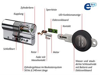 Der Profil-Doppelzylinder ist mit zwei elektronischen Zylinderhälften ausgestattet. Optional ist eine Zylinderhälfte als drehgesichert erhältlich. Die Kontrolle der Schlüsselcodierungen sowie die Freigabe des Schließvorgangs erfolgen durch das Elektronikmodul. Der elektronische Schließzylinder muss nicht verkabelt werden und braucht keine eigene Stromversorgung, da diese über die Batterie des Schlüssels erfolgt. Die neuen eCLIQ-Schließzylinder sind als modulares Baukastensystem aufgebaut, mit dem sich die Zylinderlängen zwischen 56 und 240 mm leicht aufbauen lassen. Durch ein neues integriertes Schmiermitteldepot sind die Zylinder darüber hinaus wartungsfrei bis 200.000 Zyklen.